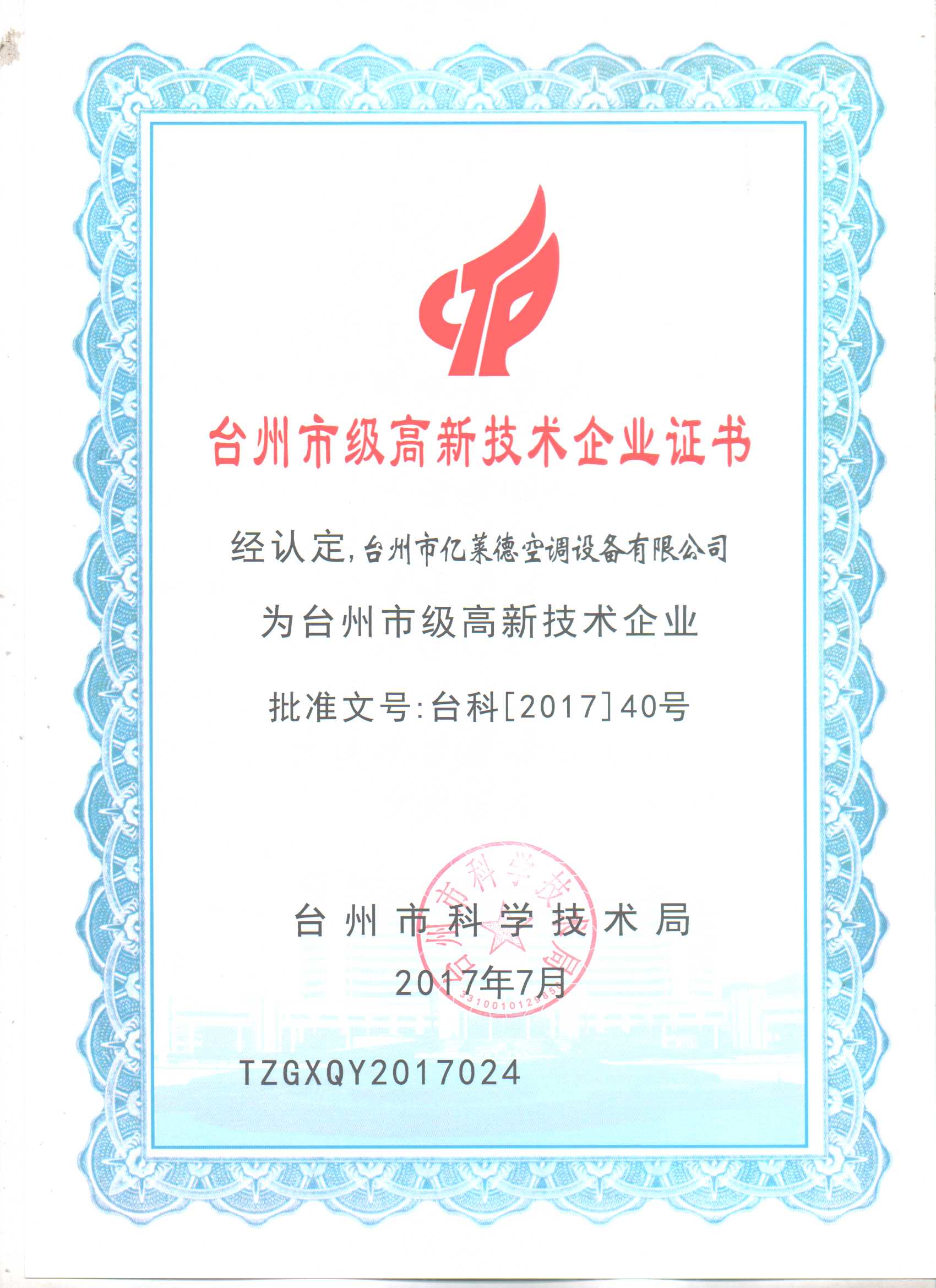 臺州市級高新技術企業(yè)證書